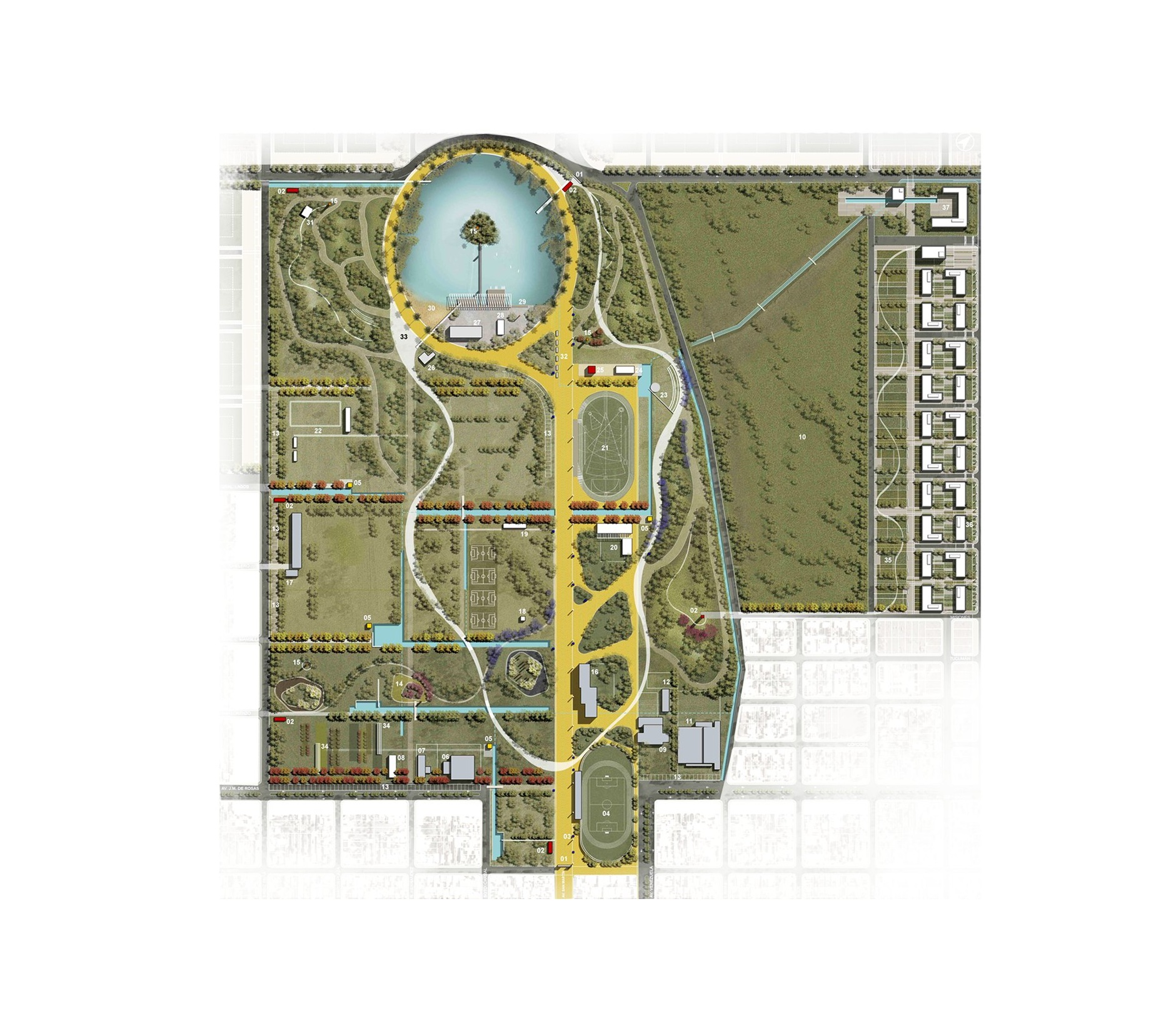 Das Projekt befasste sich mit der zukünftigen Entwicklung des Stadtparks Las Acollaradas in Bolívar, Argentinien, im Rahmen eines nationalen Ideenwettbewerbs, bei dem der Entwurf mit dem 2. Preis ausgezeichnet wurde. Ziel des Wettbewerbs war es, innovative Ansätze zur Orientierung zukünftiger Planungsentscheidungen zu sammeln. Der Entwurf schlägt eine städtisch geprägte Struktur vor, die das Stadtgefüge über einen zentralen multifunktionalen Raum mit dem Park verbindet und bestehende Gebäude sowie neue Einrichtungen integriert. Diese Achse bietet Raum für öffentliche Aktivitäten wie Spaziergänge, Kunsthandwerksmärkte, Karnevalsumzüge und bürgerschaftliche Veranstaltungen und stärkt die Verbindung zwischen Park und Stadtzentrum.